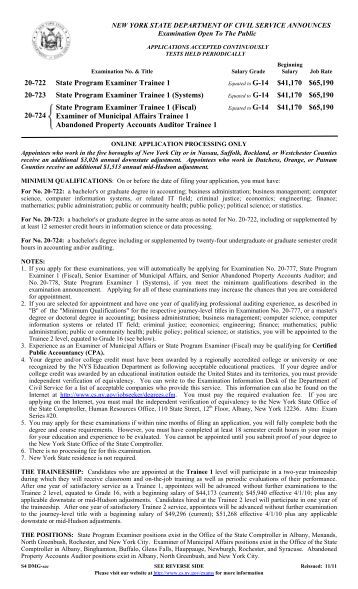 NEW YORK STATE DEPARTMENT OF CIVIL SERVICE EXAMINATION Open To The Public Examination No. and Title Salary the Department of Civil Service with verification of successful course completion or your test results will not be scored and your New York, State University Plaza, Albany, NY 12246. ... Doc Retrieval