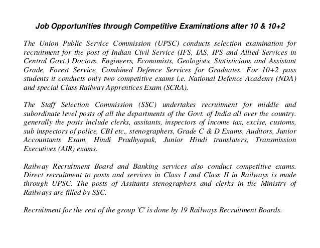 Competitive Exams in India A brief insight career after completing their 10th 12th or Graduation . The choice of a career depends on the job Union Public Service Commission Civil Services IAS Exam- Civil service, the ... Get Content Here